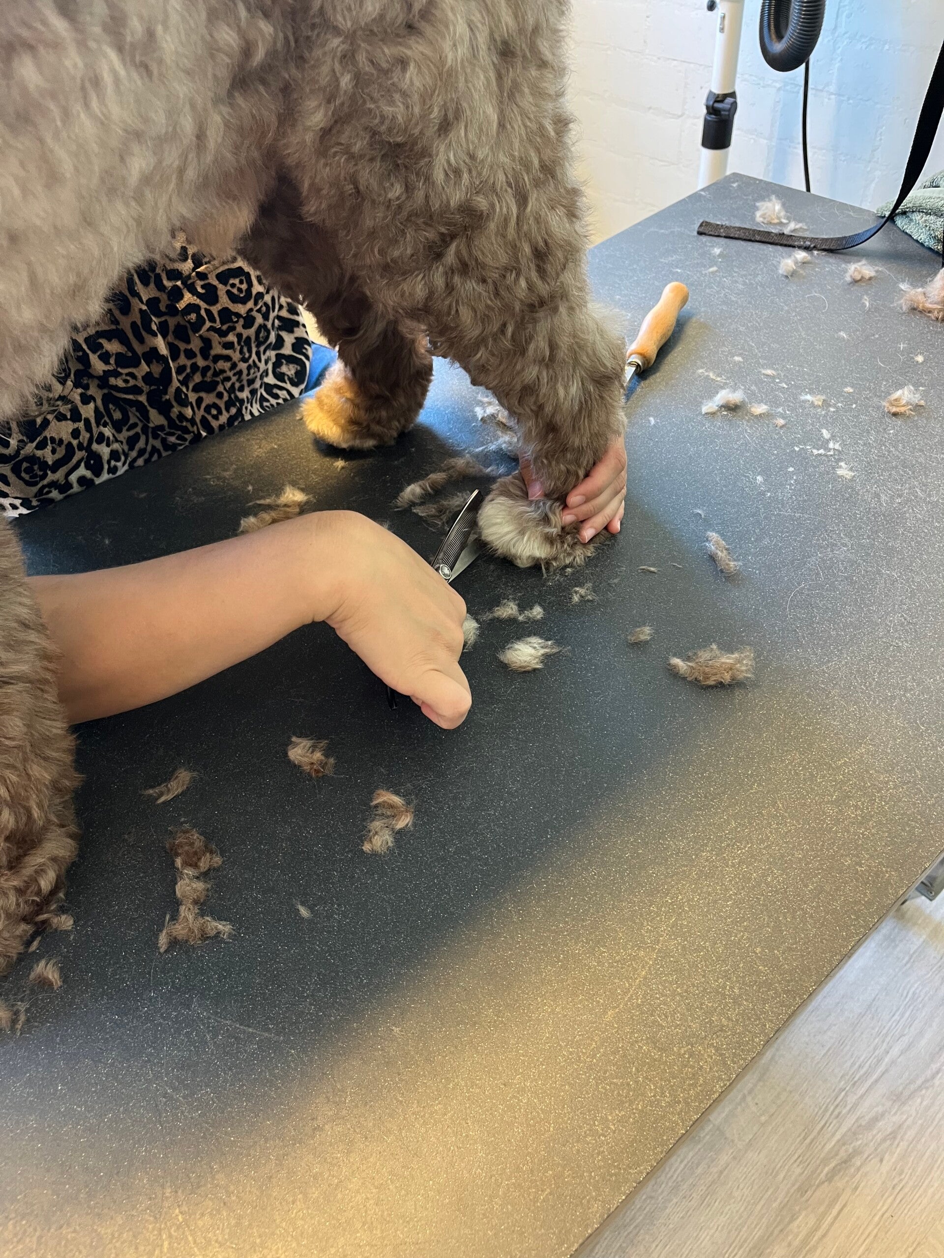 - Nadat de vacht, schoon, droog en uitgeborsteld is, leer ik jou hoe je de oogjes en de voetzooltjes vrij kunt knippen. Ook leer je hoe je de voetjes van je doodle mooi rond kunt knippen en je leert hoe je de sanitaire delen bij je hond netjes kunt houden.